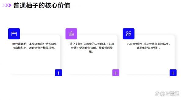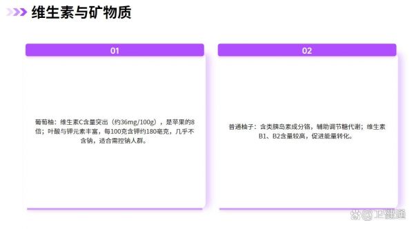 - 普通柚子:含類胰島素成分鉻,輔助調(diào)節(jié)糖代謝;維生素B1、B2含量較高,促進(jìn)能量轉(zhuǎn)化。