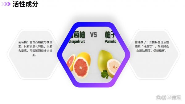 - 普通柚子:含獨(dú)特生理活性物質(zhì)“柚皮苷”,幫助降低血液黏稠度,促進(jìn)循環(huán)。