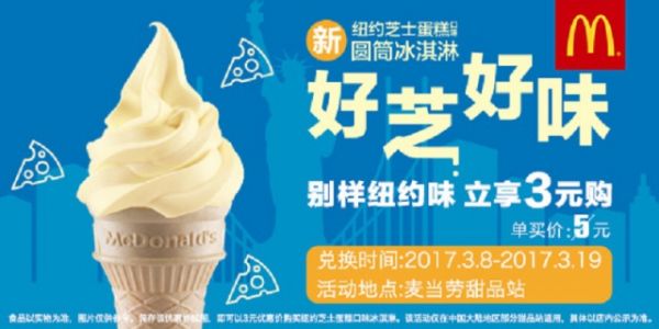 *食品及包裝以實物為準,圖片僅供參考。上述產(chǎn)品推廣日期自2017年3月8日至2017年3月28日,僅在中國大陸地區(qū)的部分參與活動麥當勞適用,具體活動信息以餐廳公示為準。冰淇淋畫面中的紐約芝士蛋糕非冰淇淋產(chǎn)品的構(gòu)成部分,僅為說明冰淇淋產(chǎn)品的口味。僅限早餐時段后供應(yīng),早餐供應(yīng)時間以餐廳實際供應(yīng)情況為準,至上午10:30結(jié)束。除食物外,其他物品(包含容器、紐約芝士蛋糕等)不在售賣范圍內(nèi)。3元甜筒兌換活動限2017年3月8日-3月19日,僅適用于中國大陸地區(qū)部分麥當勞甜品站,具體以店內(nèi)公示為準。