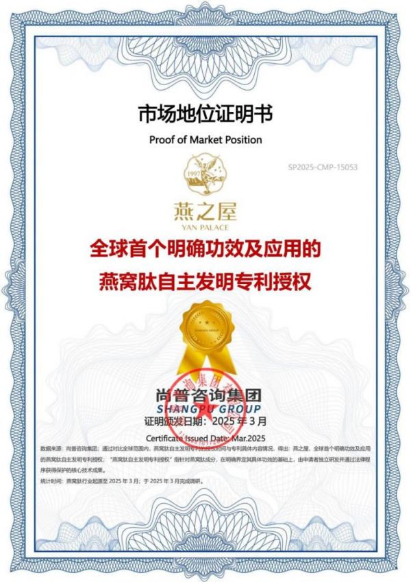 在燕窩肽研發(fā)上的持續(xù)發(fā)力、不斷取得重要進展與突破,經(jīng)權(quán)威機構(gòu)尚普咨詢集團專業(yè)認證,燕之屋獲得“全球首個明確功效及應(yīng)用的燕窩肽自主發(fā)明專利授權(quán)”市場地位證明書。在技術(shù)創(chuàng)新層面,燕之屋已形成覆蓋原料制備、功能驗證、產(chǎn)品轉(zhuǎn)化的完整閉環(huán),并以定向酶切技術(shù)放大了燕窩肽生物活性,使其在抗衰老、抗氧化等維度實現(xiàn)跨代升級,致力于為“細胞級精準抗衰”提供科學(xué)背書。