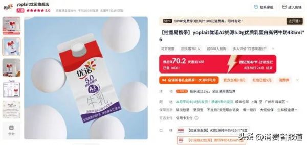 《消費(fèi)者報(bào)道》記者在光明天貓旗艦店、天貓超市內(nèi)找到該款產(chǎn)品,435ml*6瓶裝的售價(jià)分別為84元、83.4元,價(jià)格上差異甚微。對(duì)比之下,同樣是5.0蛋白含量的低溫奶,美國通用磨坊食品公司旗下的優(yōu)諾5.0A2酪蛋白牛乳,同規(guī)格產(chǎn)品的價(jià)格為70.2元。