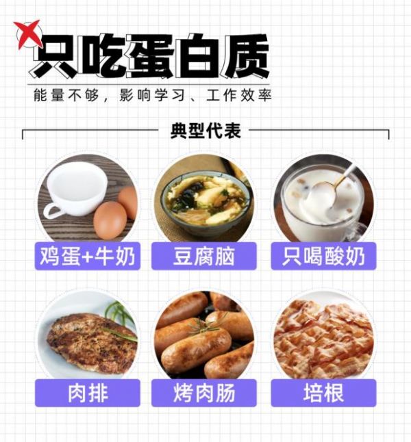 正常狀態(tài)下,大腦主要是利用葡萄糖提供能量。如果只吃高蛋白的食物,不吃碳水,就可能會(huì)造成血糖偏低,影響你一整個(gè)上午的學(xué)習(xí)、工作效率。