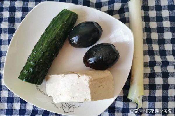 準(zhǔn)備的材料:皮蛋兩個(gè),老豆腐一塊,黃瓜半根。