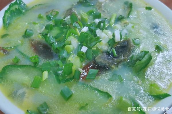 步驟4:水開以后就會(huì)看到湯已經(jīng)變成奶白色,再把花瓜放進(jìn)去轉(zhuǎn)小火慢燉,用淀粉水勾下欠,加少許的鹽調(diào)味攪拌均勻,再撒上一些蔥花或者香菜進(jìn)去這道湯就做好了,是不是很簡單呢。