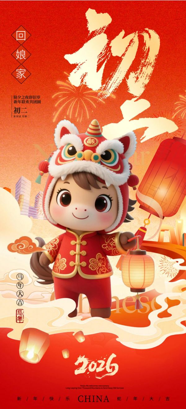 3. 2026馬年大年初二歡歡喜喜!過去一年你勇敢面對挑戰(zhàn)超勇敢,如同駿馬跨越艱難險阻。新的一年愿你勇氣加倍,困難都能輕松化解,初二出門游玩,心情格外舒暢,生活越過越精彩!