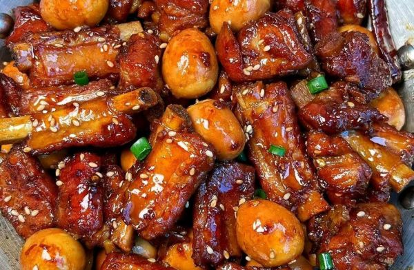 做法:①排骨洗凈切塊,冷水下鍋加入蔥姜料酒焯水撈出控干水分,鵪鶉蛋煮熟剝殼備用