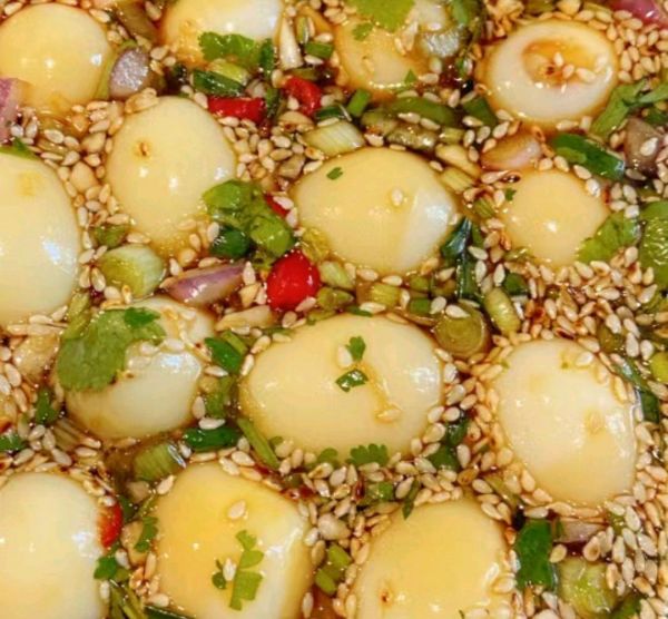 食材:鵪鶉蛋,白芝麻,小米辣,洋蔥,大蒜,蔥,檸檬片,白芝麻,香菜