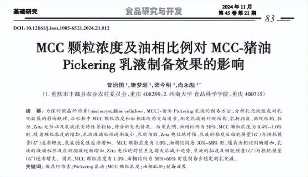 曾治國;康夢瑤;陸今明;尚永彪 MCC顆粒濃度及油相比例對MCC-豬油Pickering乳液制備效果的影響,食品研究與開發(fā) 2024-11-10