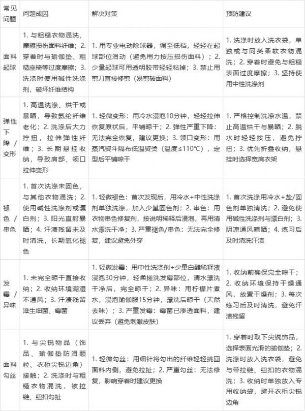即使日常護理中格外注意,瑜伽服仍可能出現(xiàn)起球、變形、褪色、發(fā)霉等問題。針對這些常見痛點,以下是科學的解決對策,幫助延長產品使用壽命,具體內容如下表所示: