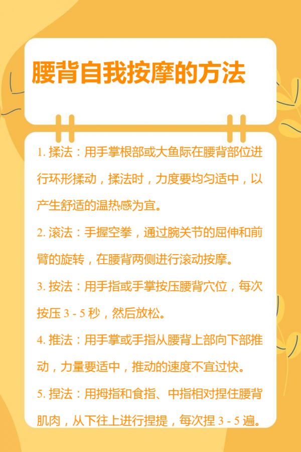 3. 按法:用手指或手掌按壓腰背穴位,如腎俞、委中、命門等,每次按壓 3 - 5 秒,然后放松。