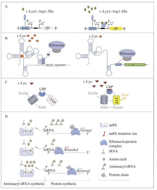 圖 1 氨基酸生物傳感器及其工作原理Fig. 1 The working principles of different types of amino aicd biosensors. A:基于轉(zhuǎn)錄調(diào)控因子的生物傳感器. B:基于核糖體開關(guān)的生物傳感器. C:基于熒光共振能量轉(zhuǎn)移系統(tǒng)的生物傳感器. D:基于蛋白質(zhì)翻譯元件的生物傳感器[8] A: The biosensor based on trasncription factor (TF). When the intracellular concentration of effectors such as the alkaline amino acids is elevated, the TF LysG binds to the effector L-Lys and the complex binds to the lysE promoter to initiate the transcription of downstream gene. B: The biosensor based on riboswitch. When the intracellular concentration of effectors such as L-Lys is elevated, the aptamer of riboswitch binds to the effector L-Lys and undergoes structural change. The ribosome binding site (RBS) forms senior structure and the transcript of downstream gene cannot be translated. C: The biosensor based on F?rster resonance energy transfer (FRET). FRET-based biosensors consist of a donor domain (cyan fluorescent protein, CFP) and an acceptor domain (yellow fluorescent protein, YFP) which links to the N- and C-termini of the ligand-binding protein (LBP), respectively. When the effector L-Lys binds to the LBP, a conformation change shortens the distance between the donor and acceptor domains. The wavelength emitted by the donor domain excites the acceptor domain and produces detectable fluorescent signals. D: The biosensor based on translation machinery. Aminoacyl-tRNA synthetase (aaRS) specifically recognizes its corresponding amino acid and tRNA to generate corresponding aminoacyl-tRNA. Certain mutations in the amino acid-binding domain of aaRS can reduce the affinity to its corresponding amino acid and slow down the translation process and hinder cell growth. When the intracellular concentration of corresponding amino acid is elevated, the aaRS variant with poor affinity can synthesize enough aminoacyl-tRNAs and cell growth can be compensated. Figure 1D was adopted from the paper by Sun, et al[8].
