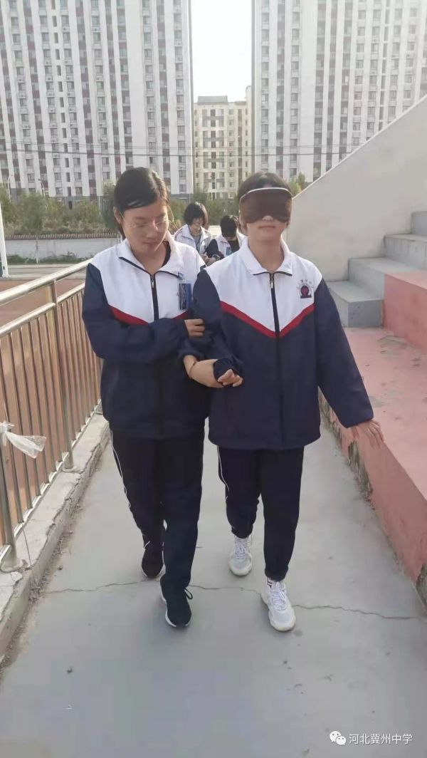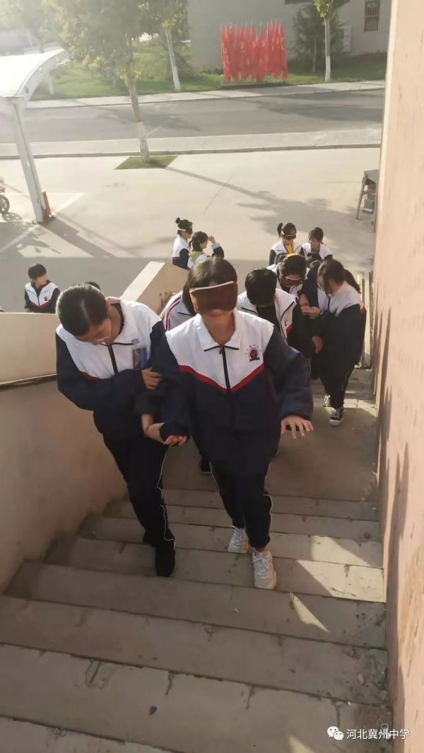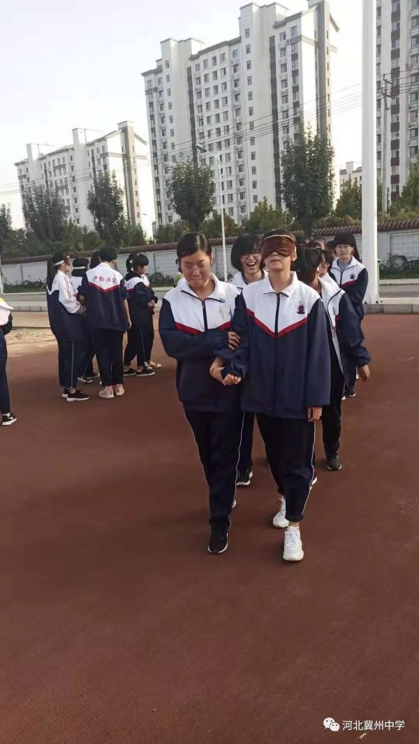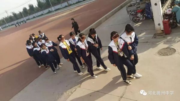 3、學(xué)生們在活動(dòng)中積極認(rèn)真,情緒高漲,通過分享活動(dòng)感受,收獲頗多。這是一次信任之旅?!懊と恕泵缮涎劬?,原地轉(zhuǎn)3圈,暫時(shí)失去方向感。然后在“拐杖”的攙扶下,沿著規(guī)定的路線前行,旨在學(xué)生參與、感受無聲的世界,并通過相互之間的幫助增加信任,共同完成自己的目標(biāo)。同時(shí)感受“盲人”和“拐杖”的世界,使學(xué)生了解換位思考的重要性。