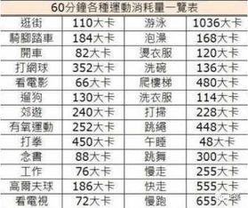 打籃球:193大卡 , 踢足球:235大卡,乒乓球:123大卡, 羽毛球: 146大卡,快走:120大卡, 慢跑:225大卡,快跑:310大卡, 爬樓梯 :180大卡,騎馬:187大卡,滑冰:187大卡, 深蹲 :147大卡,橢圓機(jī) :156大卡,快走:120大卡,慢跑 :225大卡,快跑:310大卡, 爬樓梯 :180大卡,掃地 :102大卡,烹飪:104大卡。