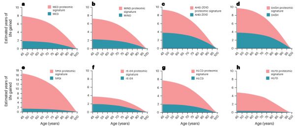 研究者表示,在預(yù)期壽命方面,遵循8種健康膳食模式其平均預(yù)期壽命可以延長(zhǎng)0.35-3.80年,而膳食模式對(duì)應(yīng)的蛋白組學(xué)特征譜其平均預(yù)期壽命提高3.74-16.72年。FSTL3等蛋白在多種健康膳食模式與慢性代謝性疾病和死亡關(guān)聯(lián)中均發(fā)揮潛在的中介作用。這些蛋白的發(fā)現(xiàn)為解析膳食模式影響糖尿病等慢性代謝性疾病的潛在機(jī)制提供了新的科學(xué)線索。研究基于膳食和蛋白組學(xué)數(shù)據(jù),首次明確8種健康膳食模式對(duì)應(yīng)的蛋白組學(xué)特征譜,并證實(shí)這些蛋白特征譜與常見(jiàn)的慢性代謝性疾病發(fā)生和死亡風(fēng)險(xiǎn)顯著相關(guān)。蛋白組學(xué)為膳食營(yíng)養(yǎng)精準(zhǔn)評(píng)估提供了全新視角,并為解析膳食因素影響糖尿病、心血管病等慢性代謝性疾病的潛在機(jī)制提供了新的線索。
