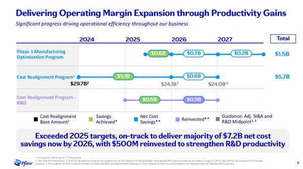 2025年,輝瑞實(shí)現(xiàn)連續(xù)三個(gè)季度營收與盈利能力雙超預(yù)期,通過2024-2025年間累計(jì)削減56億美元運(yùn)營支出,成功提升核心利潤率。這一成績在行業(yè)內(nèi)尤為突出,既能實(shí)現(xiàn)百億級成本優(yōu)化,又能保持七個(gè)季度(2024年四季度+2025年三季度)業(yè)績超預(yù)期的公司寥寥無幾,充分印證了其高效執(zhí)行能力。