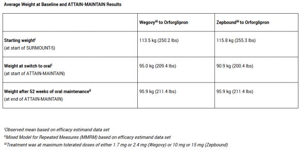 ATTAIN-MAINTAIN 研究納入了 SURMOUNT-5 試驗(yàn)的既往受試者,這些受試者此前已接受最高耐受劑量的司美格魯肽注射液(Wegovy)或替爾泊肽注射液(Zepbound)治療72周,隨后被重新隨機(jī)分組,分別接受orforglipron或安慰劑治療,療程長達(dá)52周。與安慰劑相比,orforglipron在一年治療期內(nèi)達(dá)到了主要終點(diǎn)及所有關(guān)鍵次要終點(diǎn),在配合健康飲食與規(guī)律運(yùn)動的基礎(chǔ)上,展現(xiàn)出更優(yōu)的體重維持效果。尤其是在此前減重進(jìn)入平臺期的受試者中,Orforglipron 顯著提高了減重成果的維持率。