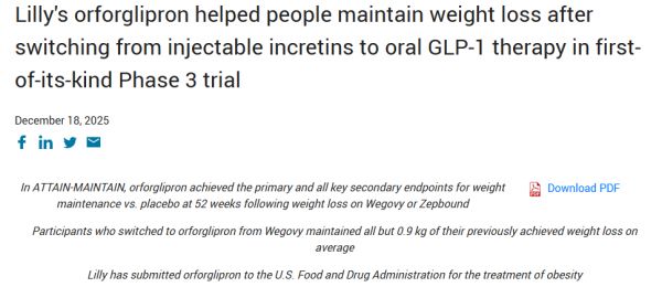 2025年12月18日,禮來公司宣布o(jì)rforglipron的III期臨床試驗(yàn)ATTAIN-MAINTAIN取得積極的頂線結(jié)果。該研究主要評估在既往成功減重后,患者使用每日一次口服 Orforglipron 進(jìn)行體重維持的療效。
