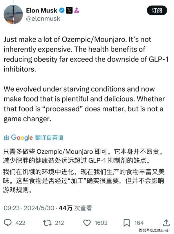 在使用過司美格魯肽和替爾泊肽后,馬斯克在X上發(fā)帖稱:“只需多做些 Ozempic/Mounjaro 就行了。它本身并不昂貴。減少肥胖的健康益處遠(yuǎn)遠(yuǎn)超過 GLP-1 抑制劑的弊端。我們在饑餓的條件下進(jìn)化,現(xiàn)在制作的食物豐富而美味。這些食物是否“加工”確實很重要,但不會改變游戲規(guī)則?!?/strong>
