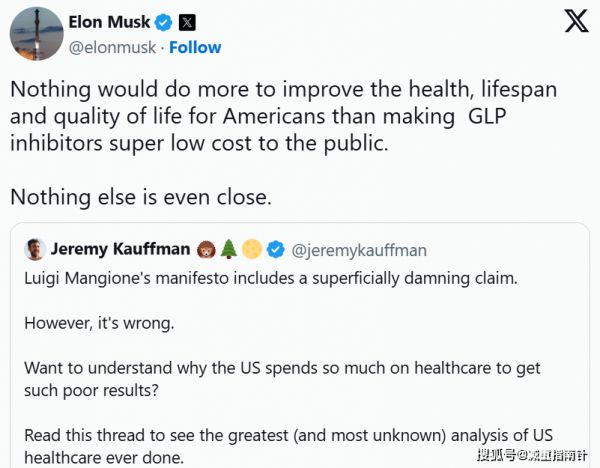 馬斯克使用了司美格魯肽和替爾泊肽減肥,是這兩種藥物最大的廣告。去年12月11日,他在X上公開表示支持減肥藥?!皼]有什么比讓[GLP-1藥物]對公眾來說成本極低更能改善美國人的健康、壽命和生活質(zhì)量了。沒有其他東西能與之媲美,”馬斯克在X上的帖子中寫道。