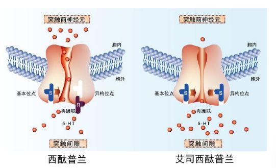 圖2 西酞普蘭與艾司西酞普蘭在體內(nèi)與受體結合情況示意圖(此圖片來自于網(wǎng)絡)