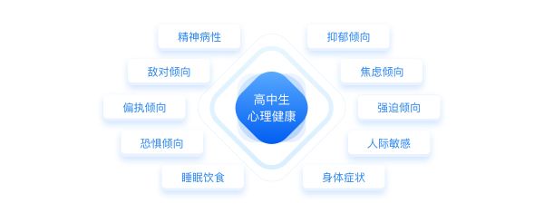 《高中生心理健康測評》以國內(nèi)外著名的“《SCL-90癥狀自評量表》《中學生心理健康綜合測量量表》《中國中學生心理健康量表》”等為藍本研發(fā)。本測驗的目的是從感覺、情感、思維、 意識、行為、生活習慣、人際關系、飲食睡眠等多個角度,評定學生是否有某種心理癥狀及其嚴重程度,讓您能夠全方位地了解學生在當前階段的身心健康狀況,并進行有效的心理調(diào)節(jié)。由“抑郁傾向”、“焦慮傾向”、“強迫傾向”、“人際敏感”、“身體癥狀”、“飲食睡眠”等十個維度組成。(見下圖)