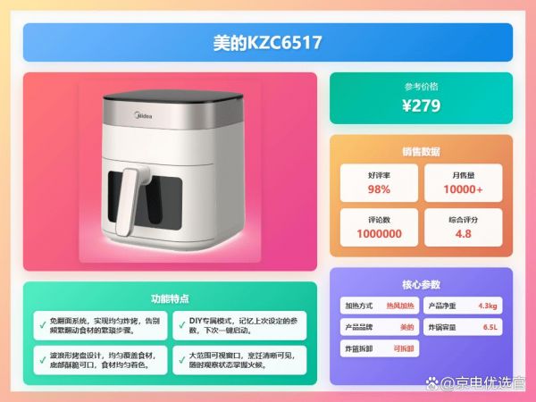 在選購空氣炸鍋時,建議綜合考慮自身的需求和預算。如果你追求加熱均勻、省時省力,上下雙熱源加熱是首選;如果家庭人口較多,那么6L以上的容量可能更適合你;同時,要關注內膽材質的安全性,避免選擇劣質涂層。我們推薦的這三款空氣炸鍋,美的KZC5394主打多功能和全金屬內腔,九陽KL60-V575則側重于蒸汽嫩炸和旋風底盤,美的KZC6517則以免翻面系統(tǒng)和可視窗口為亮點。大家可以根據自己的偏好和預算進行選擇。