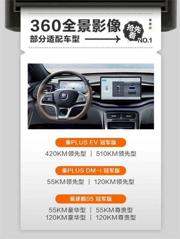 據(jù)介紹,目前適配的車(chē)型有秦PLUS EV冠軍版(420KM領(lǐng)先型、510KM領(lǐng)先型)、秦PLUS DM-i冠軍版(55KM領(lǐng)先型、120KM領(lǐng)先型)、驅(qū)逐艦05冠軍版(55KM豪華型、55KM尊貴型、120KM豪華型、120KM尊貴型)。