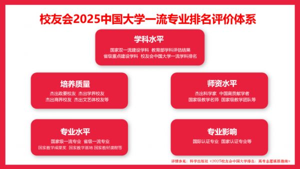 校友會中國大學(xué)一流專業(yè)排名首發(fā)于2015年,按照研究型、應(yīng)用型和技能型等3個專業(yè)類型進(jìn)行分類分級分檔評價,是目前中國參評高校數(shù)量最多、參評專業(yè)規(guī)模最大的中國大學(xué)本科專業(yè)排名。