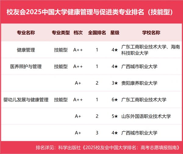 校友會2025中國大學(xué)健康管理與促進(jìn)類專業(yè)排名(技能型)