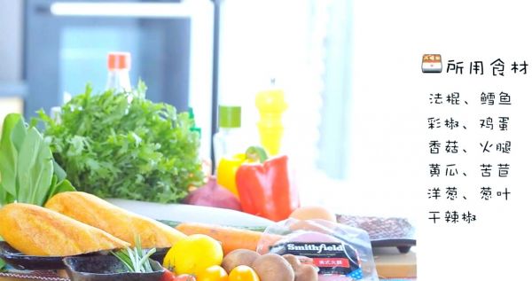蔬菜:黃瓜 20克、火腿 1片、雞蛋 1個(gè)、鱈魚 1塊、洋蔥 20克、香菇 4個(gè)、彩椒 40克、苦苣 60克