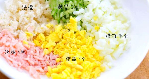 首先,將法棍切成段,再利用叉子將法棍中間部分小心掏空,留作備用。接著,把雞蛋煮熟后剁成碎末,同時(shí)將黃瓜和火腿切成細(xì)碎狀。