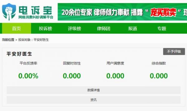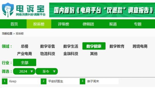 根據(jù)“電訴寶”受理的數(shù)字健康領(lǐng)域用戶有效投訴顯示(依據(jù)投訴量排行),平安好醫(yī)生排名第二位,最新評(píng)級(jí)為“不予評(píng)級(jí)”。同樣被投訴的類似平臺(tái)還有:keep、親子周末等。此前,被投訴的類似平臺(tái)依次為:1藥網(wǎng)、藥房網(wǎng)商城、健客網(wǎng)、橄欖枝健康等。