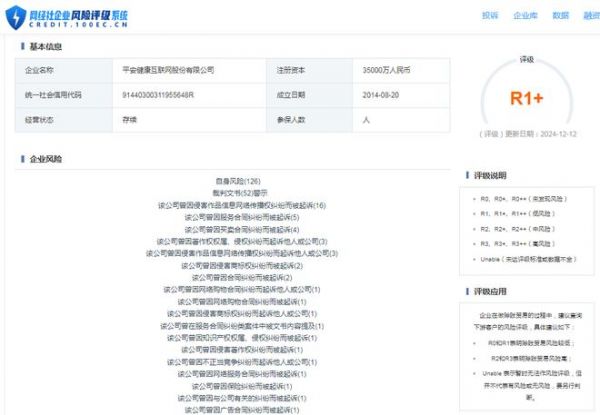 據(jù)“網(wǎng)經(jīng)社企業(yè)風(fēng)險(xiǎn)評(píng)級(jí)系統(tǒng)”顯示,平安好醫(yī)生隸屬于平安健康互聯(lián)網(wǎng)股份有限公司的風(fēng)險(xiǎn)評(píng)級(jí)為R1+,公司目前所處低風(fēng)險(xiǎn)。
