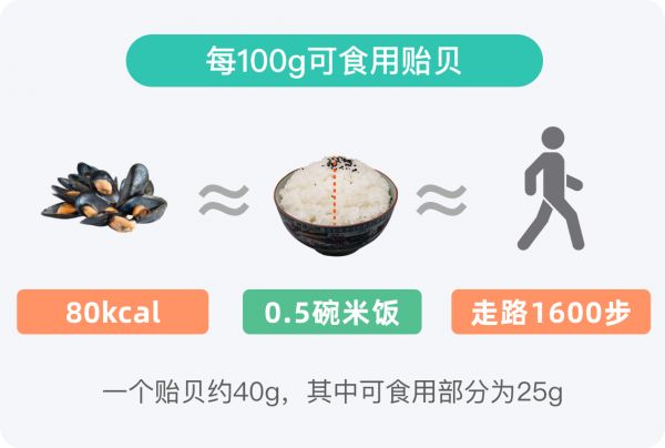 在營養(yǎng)學(xué)上,通常將食物分為高熱量、中熱量和低熱量三類。每100g熱量在100kcal以下的食物稱為低熱量食物。因此,貽貝屬于低熱量食物。一個貽貝約40g,其中可食用部分為25g,食用后所產(chǎn)生的熱量為20kcal,相當(dāng)于1/9碗熟米飯的熱量。