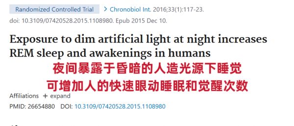 [2] Cho, Chul-Hyun, et al. "Exposure to dim artificial light at night increases REM sleep and awakenings in humans." Chronobiology international 33.1 (2016): 117-123.
