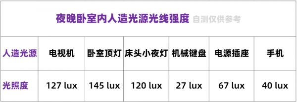 在夜晚臥室里,雖然各種人造光源的光線強度看起來數(shù)值都不高,也不怎么亮。