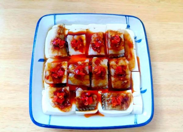 將精心調(diào)配的剁椒與醬汁均勻地淋在魚(yú)肉和豆腐上。