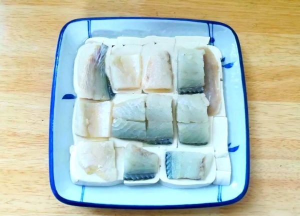 將處理好的魚(yú)肉瀝干水分,輕輕鋪放在豆腐之上。