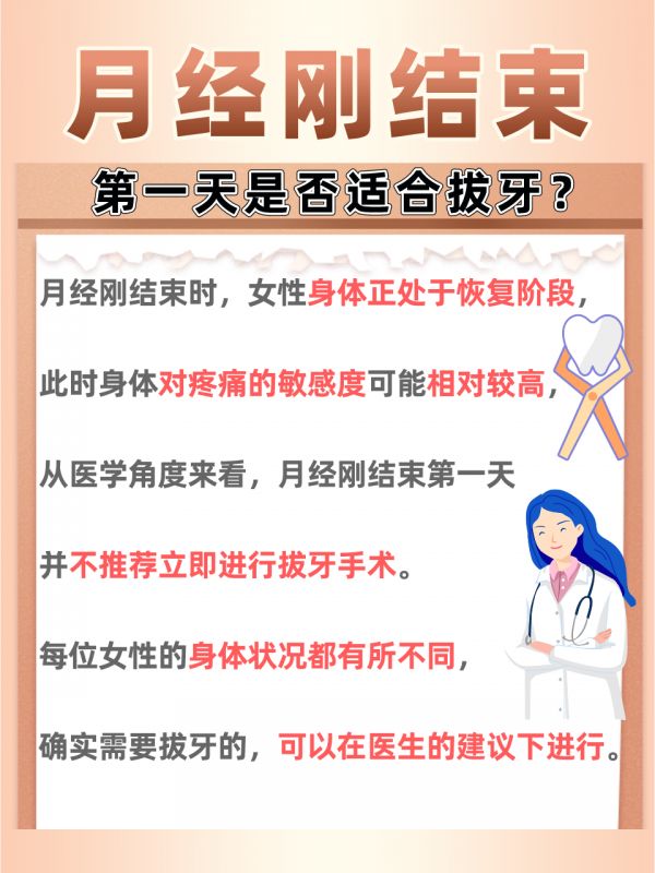 月經(jīng)剛結(jié)束時,女性身體正處于恢復(fù)階段,此時身體對疼痛的敏感度可能相對較高,同時凝血功能也可能尚未完全恢復(fù)。因此,從醫(yī)學角度來看,月經(jīng)剛結(jié)束第一天并不推薦立即進行拔牙手術(shù)。