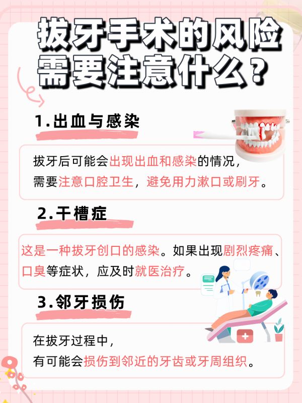 1.出血與感染:拔牙后可能會出現(xiàn)出血和感染的情況,因此需要注意口腔衛(wèi)生,避免用力漱口或刷牙。