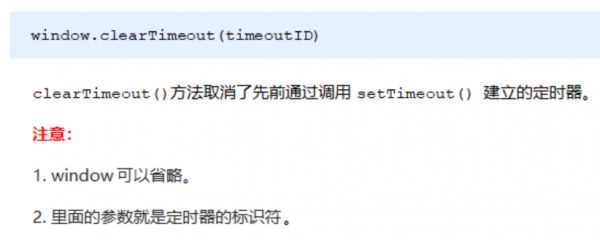<button>點擊停止定時器</button> <script> var btn = document.querySelector('button');// 開啟定時器 var timer = setTimeout(function() { console.log('爆炸了'); }, 5000);// 給按鈕注冊單擊事件 btn.addEventListener('click', function() { // 停止定時器 clearTimeout(timer); }) </script>