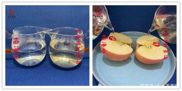 3、將準(zhǔn)備好的白毫銀針茶湯及純凈水各澆淋到對應(yīng)的蘋果切面上。