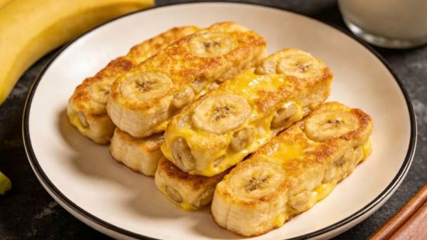 2. 饅頭條裹蛋液+香蕉碎,少油平底鍋煎至金黃