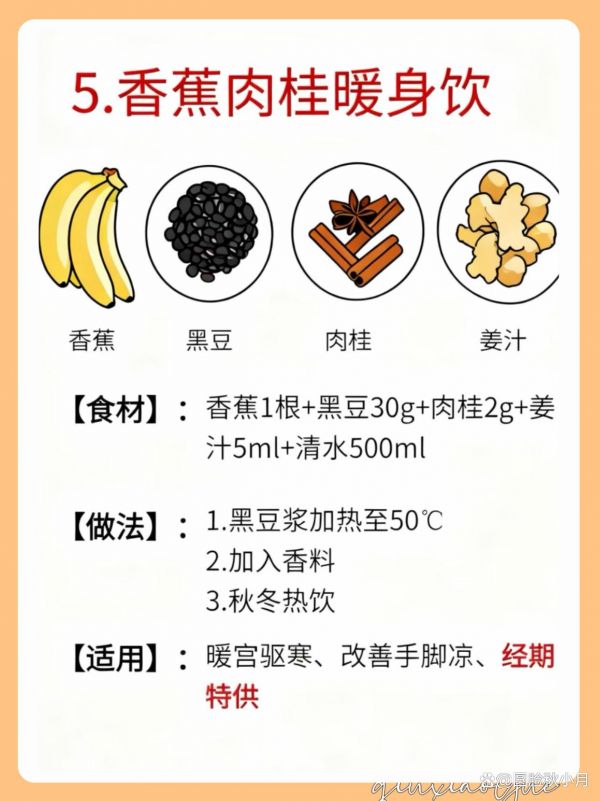 將香蕉、豆?jié){與一小撮肉桂粉一起加熱,制成溫?zé)岬娘嬈?。肉桂能改善末梢循環(huán),特別適合手腳冰涼的人。在天氣轉(zhuǎn)涼時(shí),來一杯暖暖的香蕉肉桂飲,既能滿足味蕾,又能幫助身體產(chǎn)熱,促進(jìn)能量消耗。