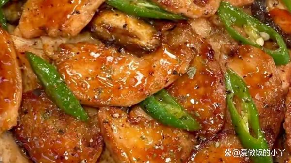 3、起鍋燒油,油熱后加入雞胸肉煎熟后撈出。再起鍋燒油,油熱后加入蒜末炒香,再下入香菇炒軟后下入雞胸肉、青椒翻炒斷生后調入鹽、生抽、黑胡椒粉炒勻出鍋即可。