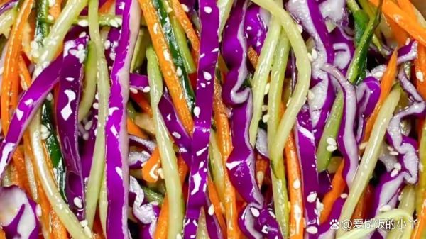 1、紫甘藍、胡蘿卜、黃瓜洗凈切絲;