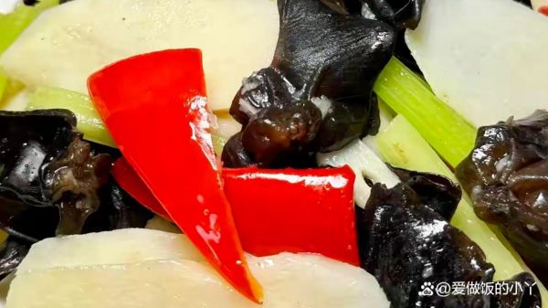 3、起鍋燒油,油熱后下入蒜末炒香,再下入木耳、山藥、紅椒、芹菜翻炒,炒熟后調入鹽、糖、雞精炒勻出鍋即可。