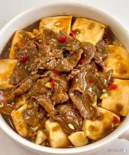 食材:豆腐一塊、牛肉適量(切片)、蔥姜蒜、食鹽、花椒粉、生抽、老抽、蠔油