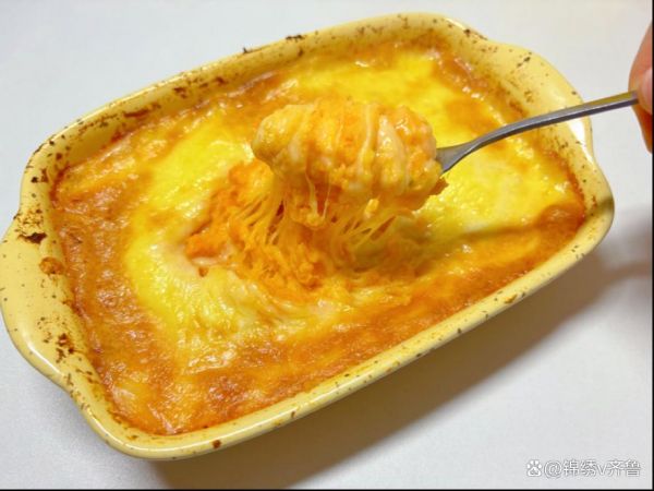 6. 裝盤準(zhǔn)備焗烤:將混合好的紅薯泥倒入烤盤中,表面撒上一層奶酪。