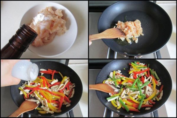 制作過程: 將雞脯肉切成細(xì)絲后加入少許鹽、生抽、料酒、淀粉等調(diào)味料拌均勻腌制3分鐘,這樣炒出來的雞肉絲更嫩。 燒熱鍋放入適量的油,加入腌制好的雞肉絲放進(jìn)鍋中翻炒至變色,加入紅黃彩椒絲放進(jìn)鍋中翻炒幾下, 加入少許鹽調(diào)味, 最后加入蔥段翻炒均勻即可。